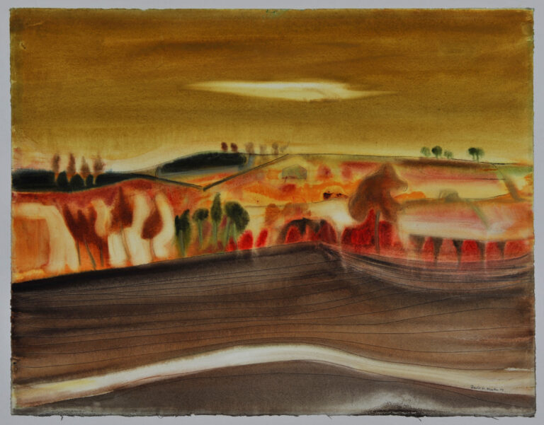 Landscape in watercolour, using simplified shapes and earthy, tonal colours.