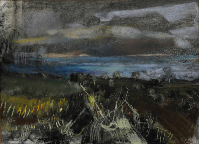 Drawing of a coastal landscape with corn stooks in the mid and foreground.
