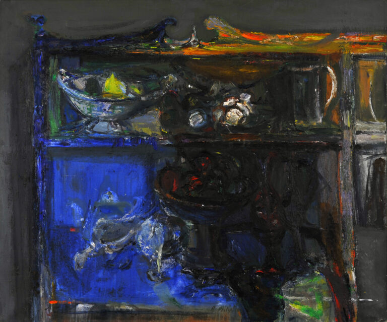 Abstracted still life painted using loose, expressive brushwork, with vivid colour contrasting with large areas of dark and shadow. The artist has painted a corner cupboard, with a bowl of fruit on the top shelf, with two pigeons and a long necked jug on the shelf beneath.