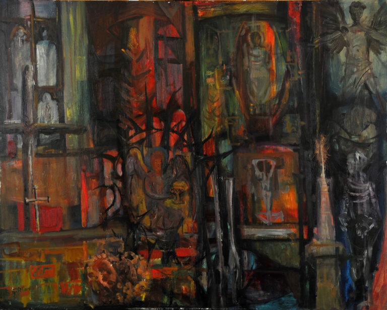 Colourfully painted depiction of a Cathedral interior. In the centre there is a winged angel holding a chalice.