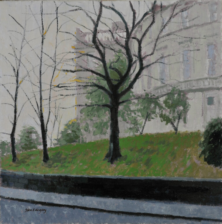 Study of a cityscape in winter, with leafless trees in the foreground, in front of a large terraced building in background.