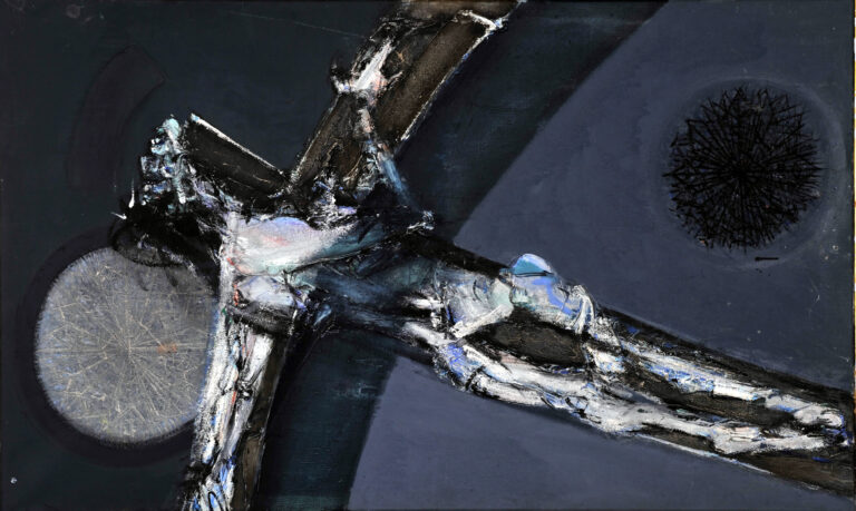 Expressively painted figure on a cross, across the diagonal of the canvas, against a grey background. The painting contain two circular motifs, a white circle behind the figure s head, and a black circle to the right of the figure s legs.