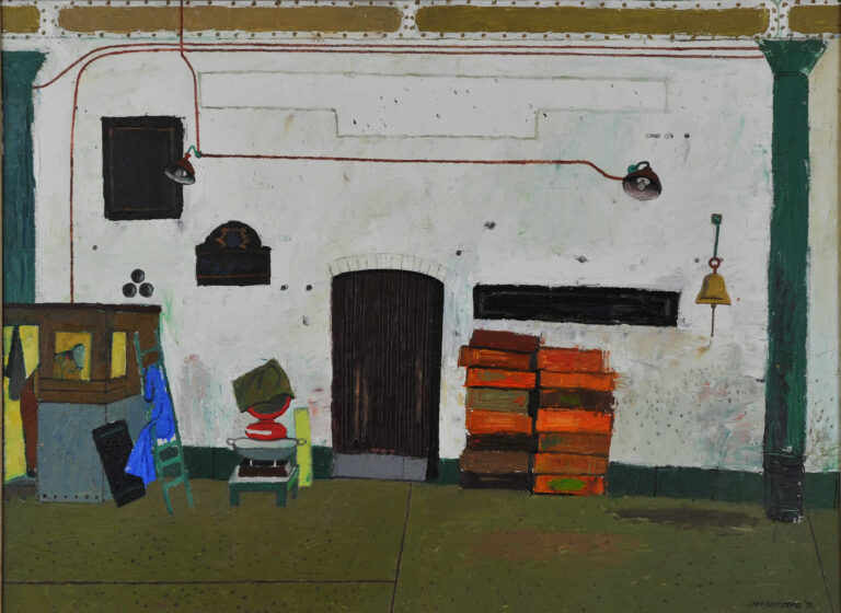 Study of an interior, with a man in a booth to the left, alongside red weighing scales covered by green cloth. In the centre of the painting is a brown wooden door, and to the right stacked wooden fish boxes and a bell.
