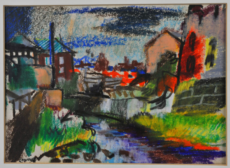 Drawing of industrial buildings with a stream in the foreground. The use of strong colour and bold mark making give the work an abstract tone.