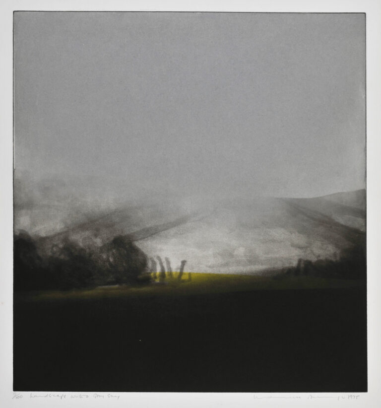 Norman Ackroyd RA (born 1938), studied at Leeds College of Art and The Royal College of Art, London. He is one of Britain’s foremost landscape artists and contemporary printmakers working today. He is known primarily for his monochromatic aquatints. Depending on the locale, atmospheric conditions and intended mood, his compositions are minimalist, giving an abstract, sometimes geometric impression. Often they depict or suggest naturalistic elements, e.g., hills, clouds, rainbows. Even when depicting rainbows, Ackroyd uses colour only very sparingly. Although his work almost never includes the human figure, the landscape subjects he prefers are often ones of age-old human habitation.