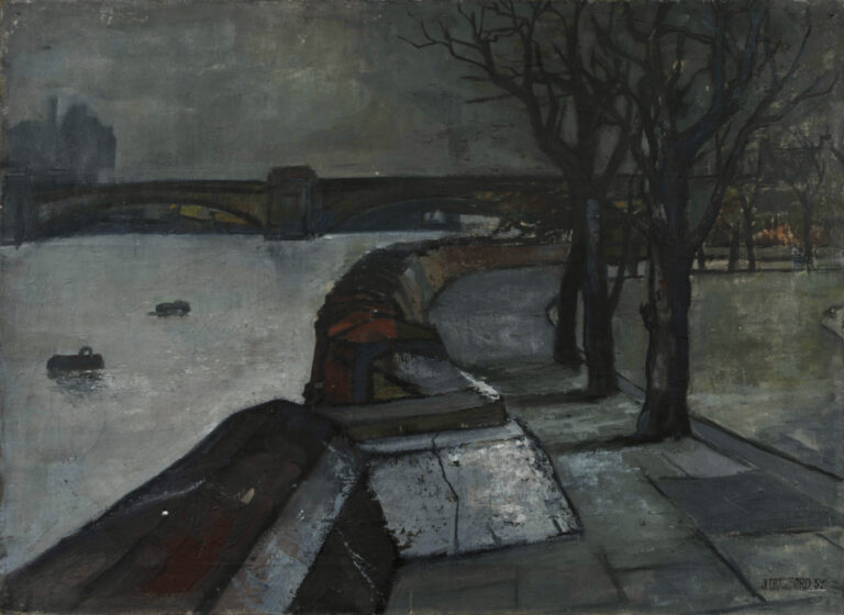 Winter study of the London Embankment, with the river to the left, the embankment to the right and bridge on the horizon.