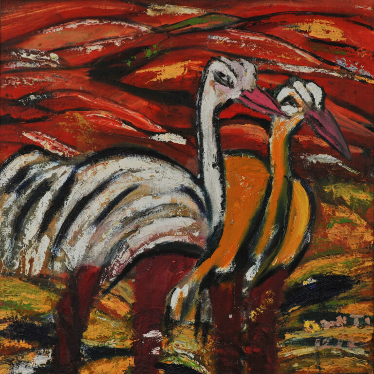 The painting depicts two ostriches, against a vibrant coloured, undulating background.