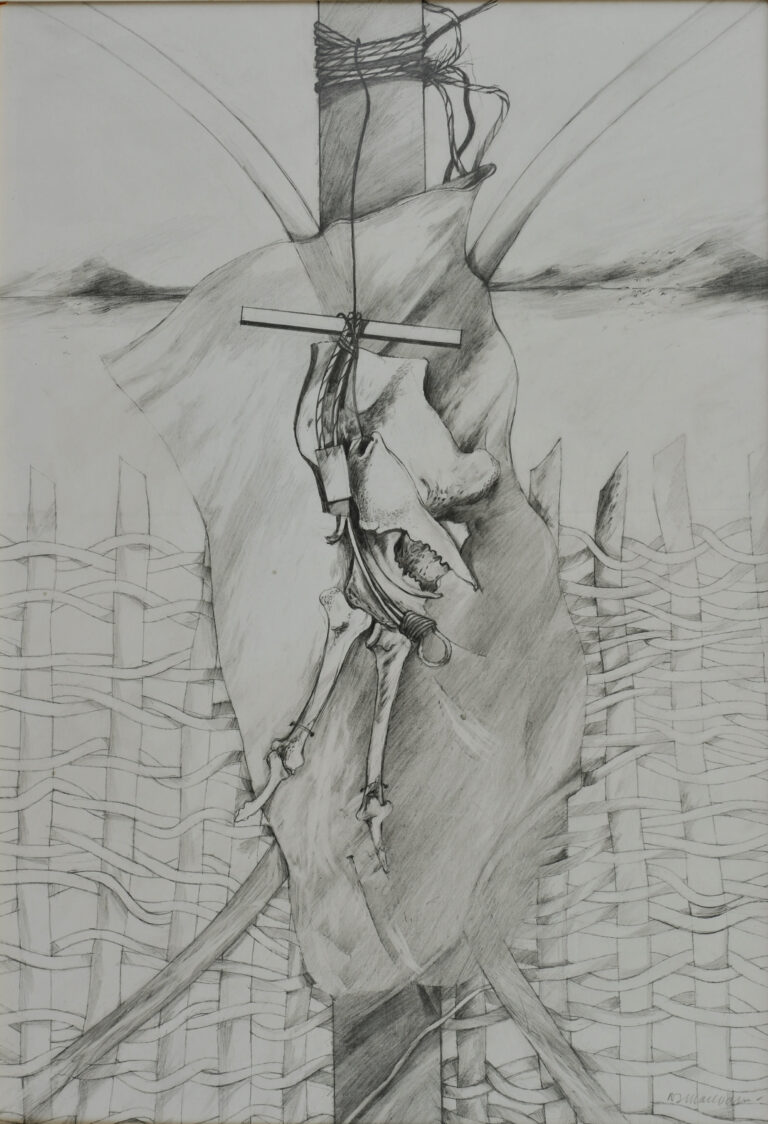 Drawing of a collection of bones, a crab claw and other objects hanging in front of a rectangular cloth tied to a post with a wattle fence behind and receding hills beyond.