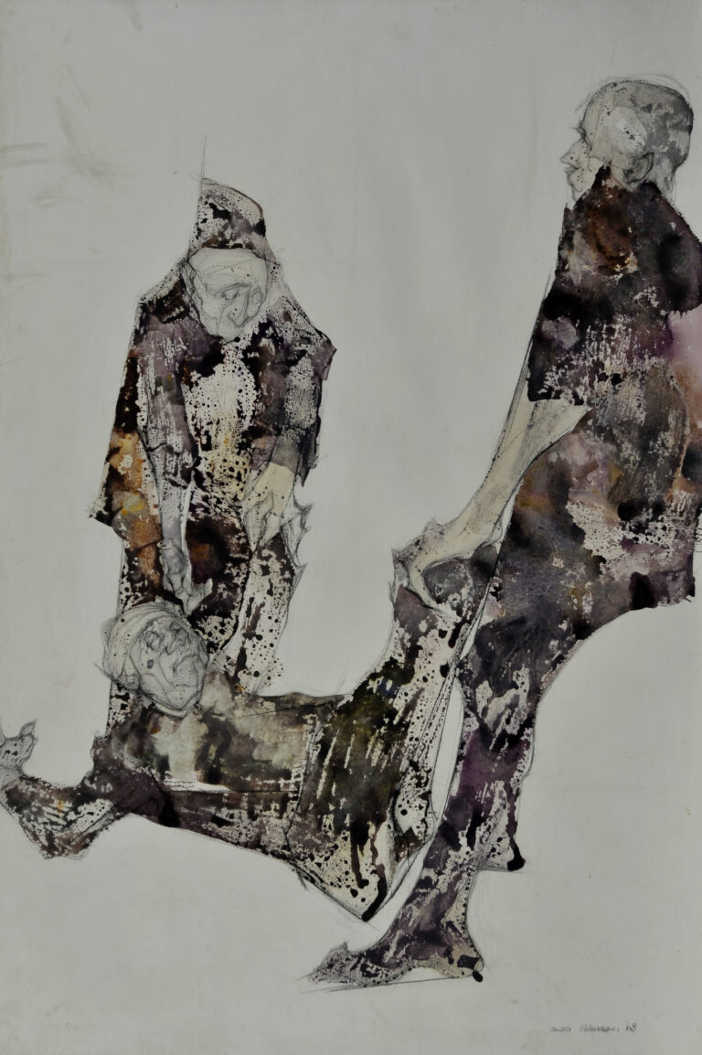 Drawing of two figures, who appear to be dragging a recumbent figure along, in muted, textured inks.