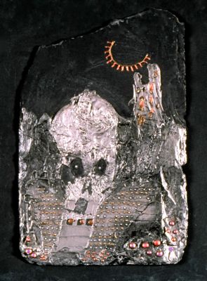 Image of a skull and eclipsed sun on a slate tile adhered to a black support board, with mixed media applied to the surface, coloured pva, silica and coloured paper.