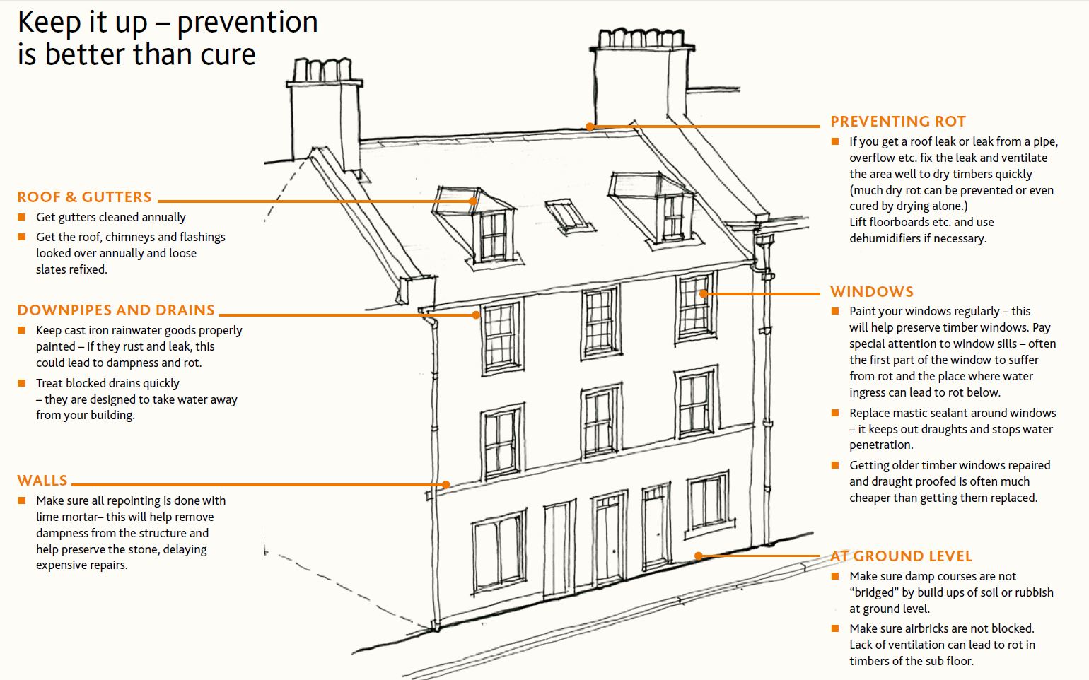 The illustration below is a guide to good maintenance practice, (click on the image to enlarge). The best thing to remember is to look up and take note of what’s happening with your property.