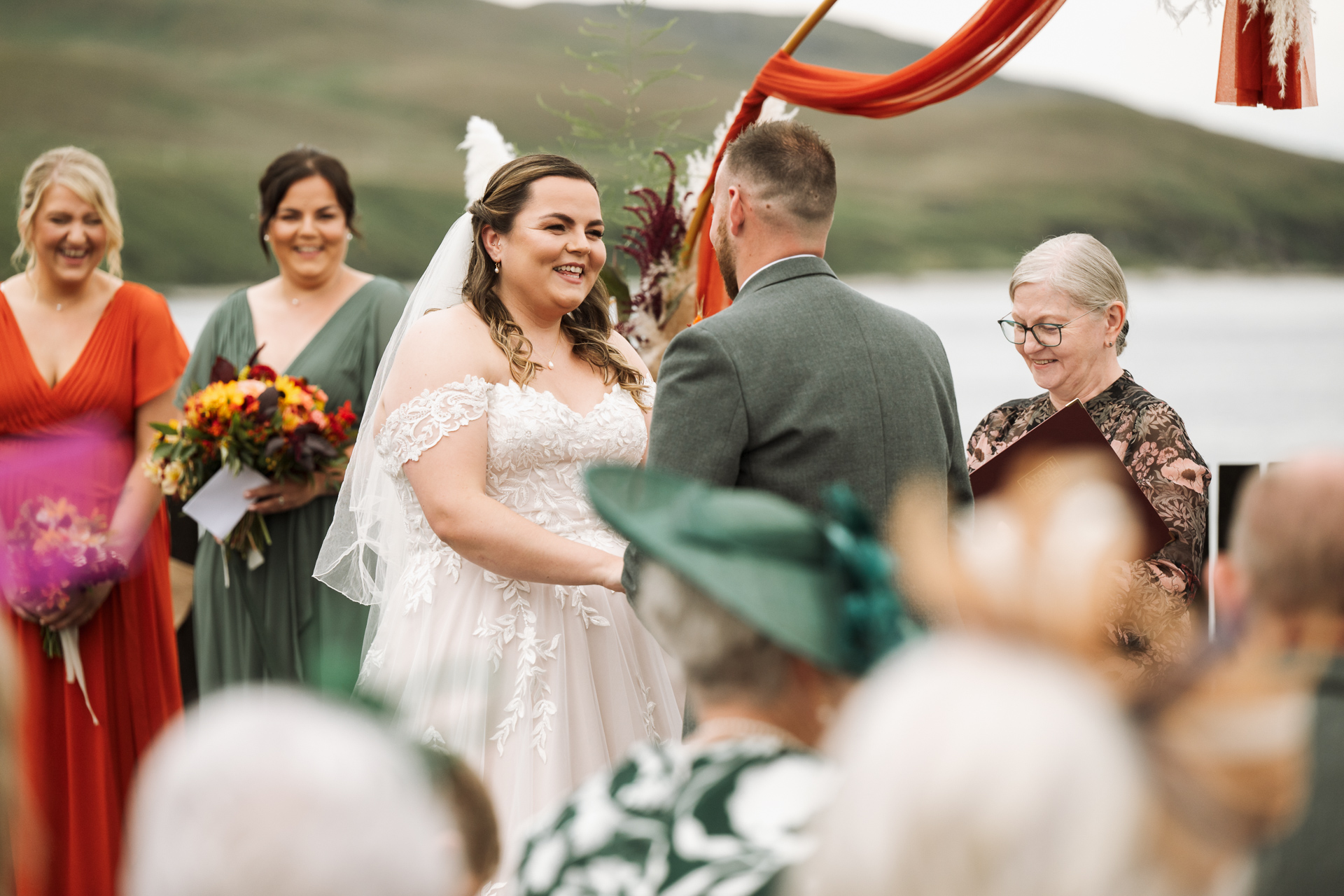 ‘Before coming to live on Islay I worked in Registration in Cumbria, performing ceremonies at licenced venues across the county. I’ve found ceremonies on Islay, and in Argyll and Bute overall, are more unique and personal compared to the majority I have taken part in previously. Luckily, couples considering holding their ceremony on Islay have an extensive choice of what to include from the options offered when they plan and personalise their special day. Being involved in their preparations and conducting their ceremony is indeed a great privilege, one I wholeheartedly enjoy. The scenic locations on Islay offer amazing photographic settings like no other and every ceremony I’ve been involved in so far has created special memories, rain or shine!’