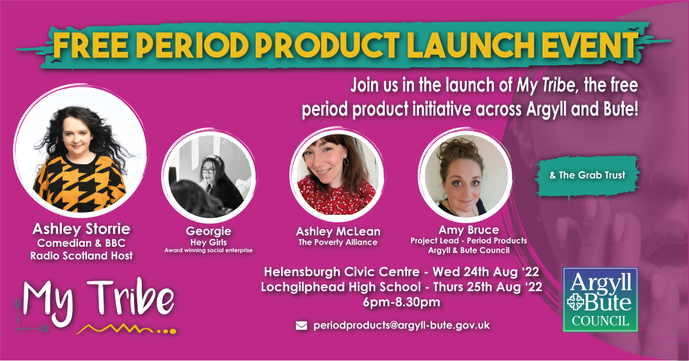My Tribe, funded by the Scottish Government, aims to help raise awareness of the availability of free products in Argyll and Bute and break down barriers around talking about periods. To mark the launch of the initiative the council is hosting two free, fun and inclusive community events in Helensburgh and Lochgilphead.