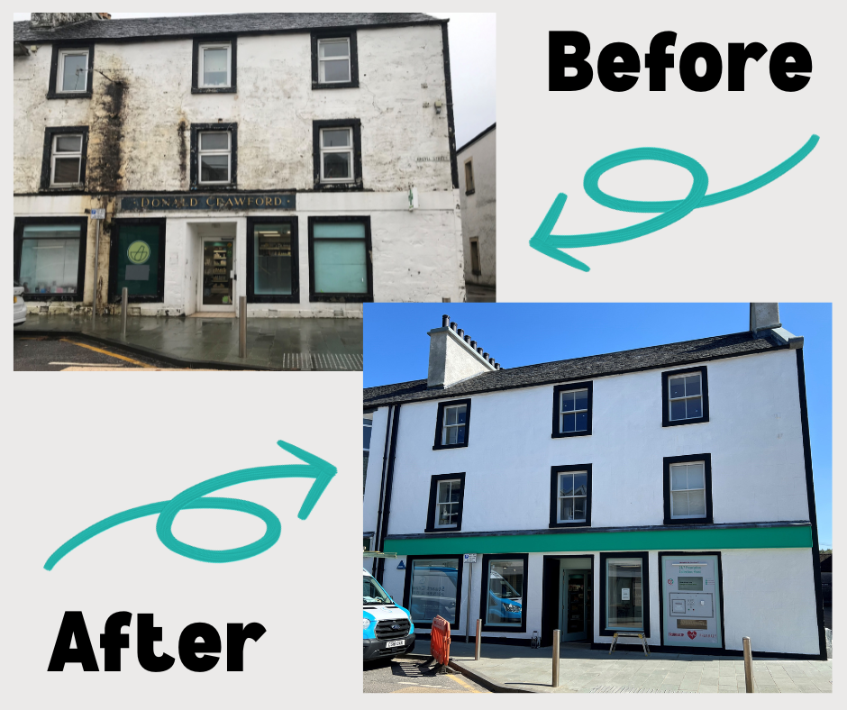 These shopfronts have been restored to a high-quality heritage standard, benefitting from various improvements, including new hardwood glazed timber doors, double glazed windows, lead-covered fascias, new colour schemes and traditional hand-painted signage. Notably, Argyll Pharmacy now boasts a new state-of-the-art dispenser, enabling people to access their prescriptions 24 hours a day. The grant awards for these projects also includes funding from the Scottish Governments Place Based Investment (PBI) Programme. Numerous Small Repair grant projects have also been completed over the past few years as part of the initiative.