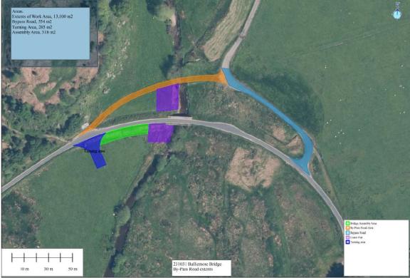 This is a map which shows the new alignment of the road at Balliemore Bridge, where the new temporary bridge will go slightly upstream of the existing bridge. The old bridge will be demolished and a permanent replacement progressed for April 2024.