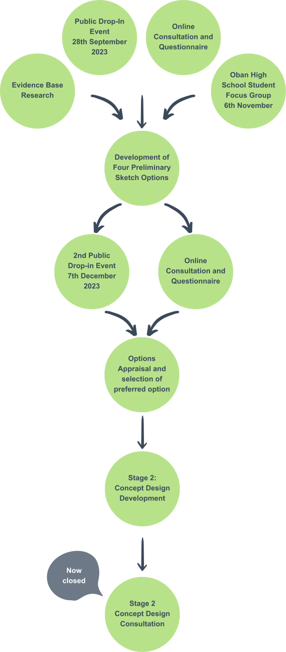LUC held an initial public consultation between September and October 2023 to help identify opportunities and constraints to active travel within Oban and particularly the project area. A further public consultation on potential design options was held between December 2023 and January 2024.